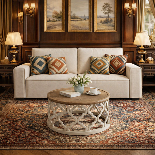 View full detailsThis coordinated living room bundle includes one 85-inch beige chenille 2-seater sofa and one round farmhouse coffee table with tray-style t...