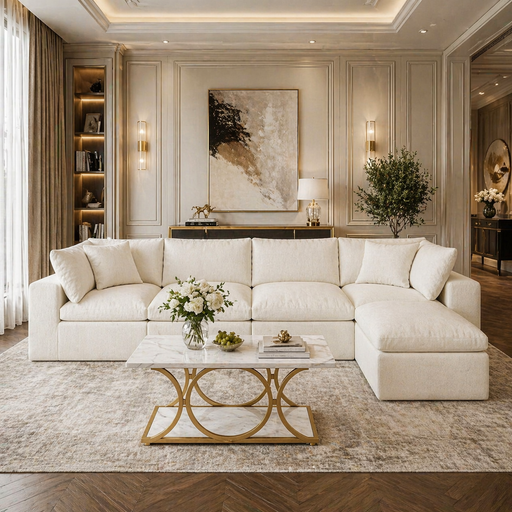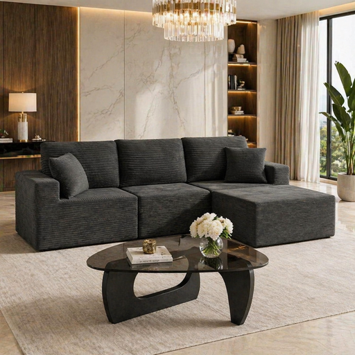 View full detailsOverviewThis coordinated living room bundle includes a modern L-shaped boneless cloud sectional sofa paired with a triangle tempered ...