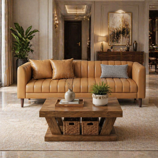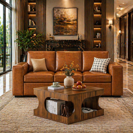 View full detailsElevate your living space with an 85-inch faux-leather 3-seater sofa paired with a round nesting coffee table set in a warm brown burl finish. Thi...