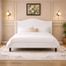 One white queen velvet platform bed with wingback headboard and two white nightstands with charging stations.
