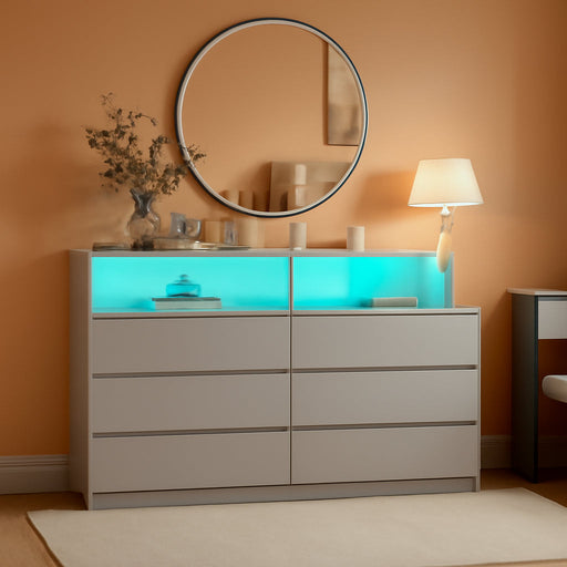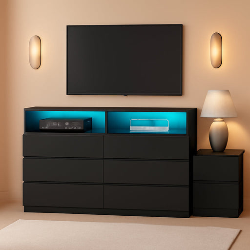 View full detailsCharge, organize, and set the mood—all from one elegant 6-drawer dresser. This modern piece blends built‑in power with customizable lighting to si...