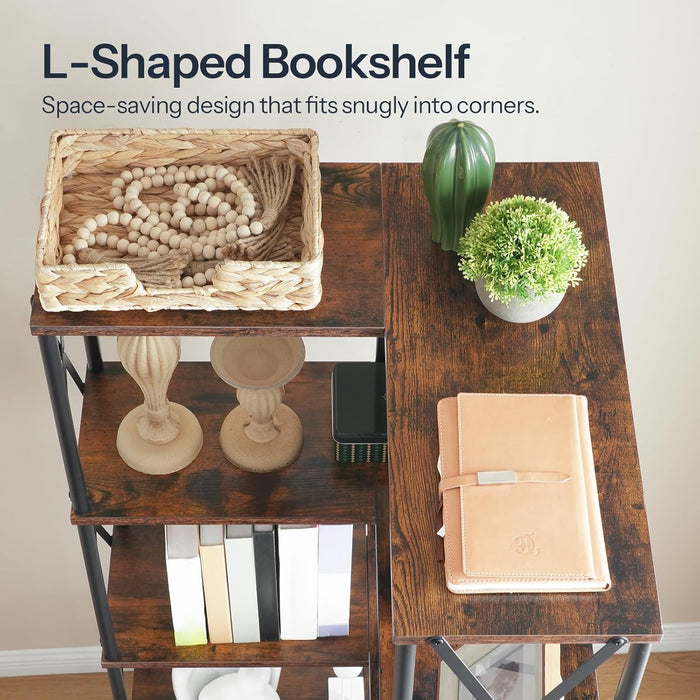 Corner Bookshelf 5-Tier L-Shaped Industrial Bookcase In Rustic Brown