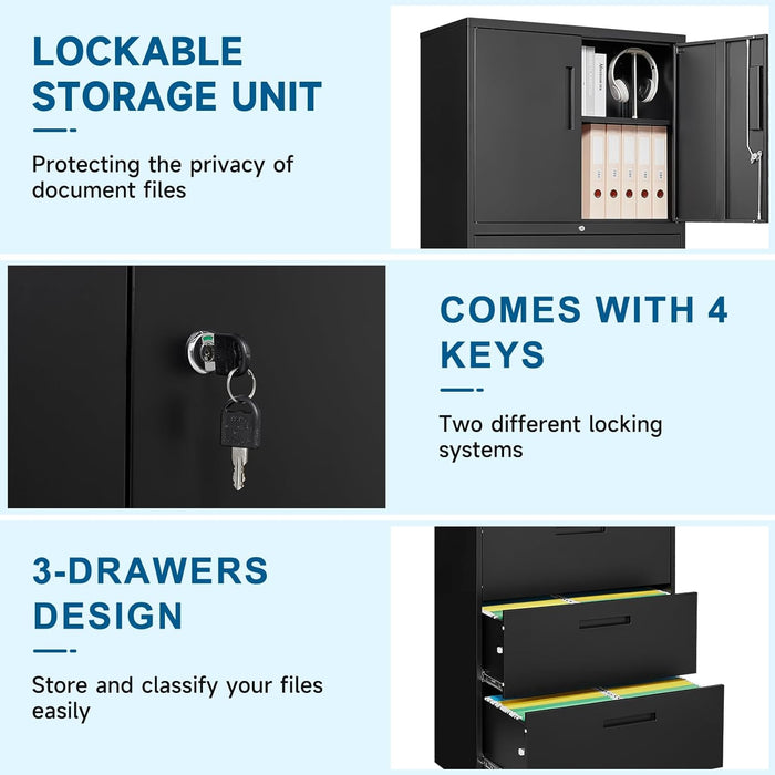 Three Drawer Metal File Cabinet Locking With Storage Shelves Black For Legal Letter A4 Documents