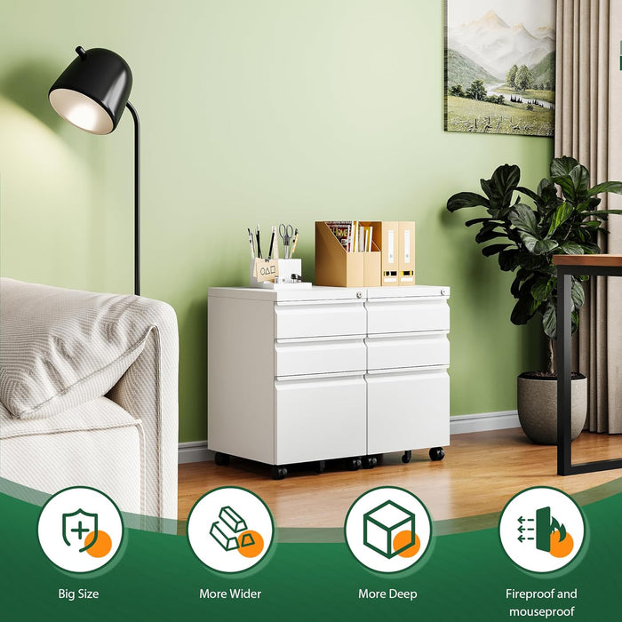 • Three-drawer design—two stationery drawers + one file drawer with a removable hanging bar; accommodates Letter, Legal, and A4 hanging folders.