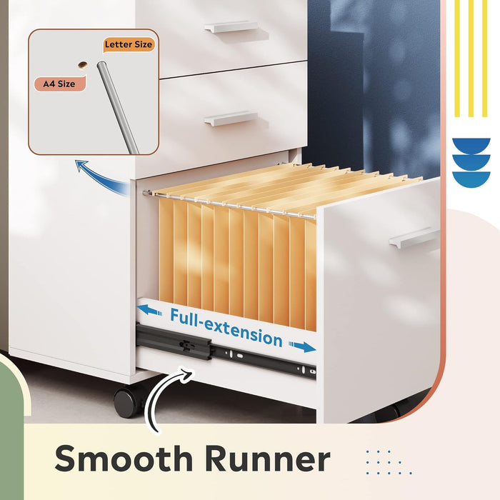 Three Drawer White Wood Mobile File Cabinet For Office Use With Letter A4 Size Compatibility Compact Storage Solution