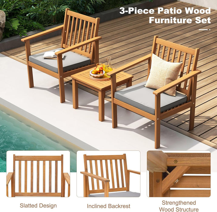 3 Piece Patio Wood Furniture Set With Acacia Wood Chairs And Coffee Table Cushions Slatted Grey Outdoor Set
