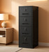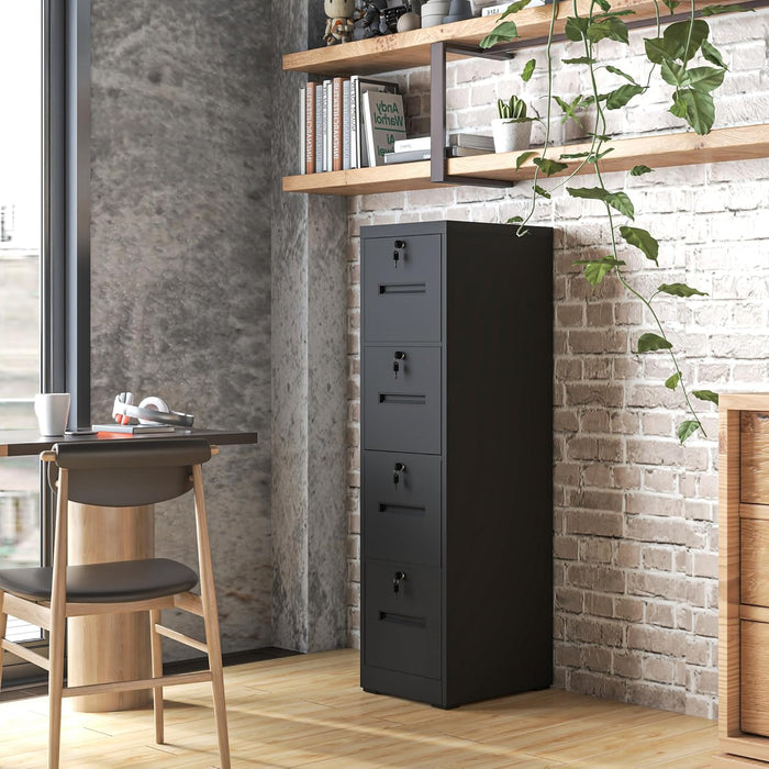 Transform your workspace with a secure, space-saving 4-drawer vertical file cabinet. Crafted in durable black steel, this home office essential keeps papers organized, protected, and within easy reach.