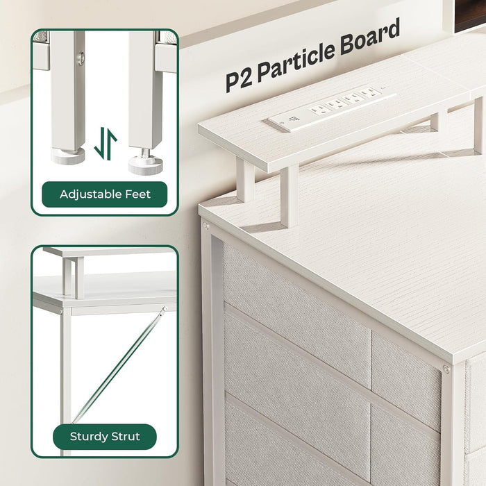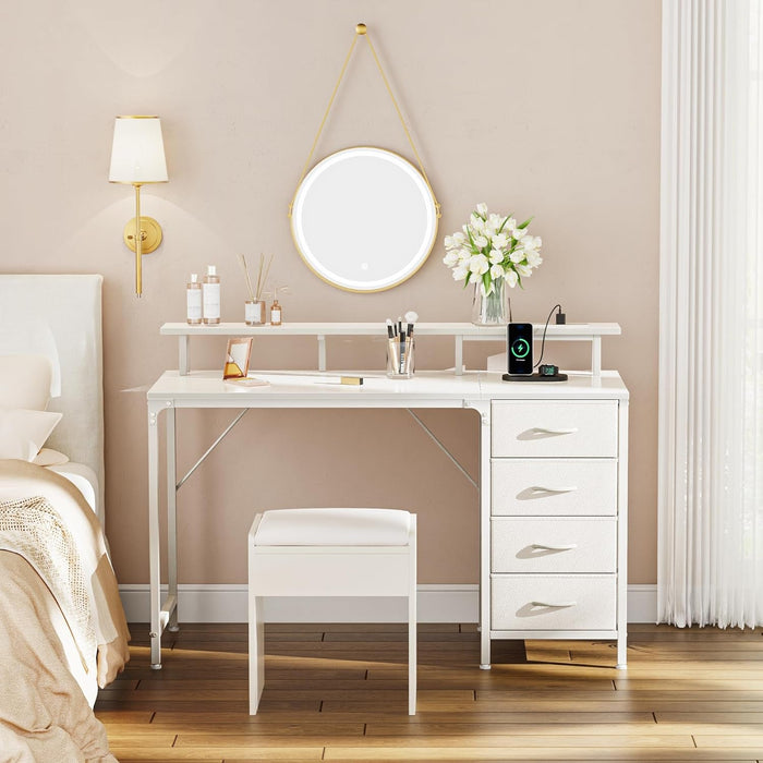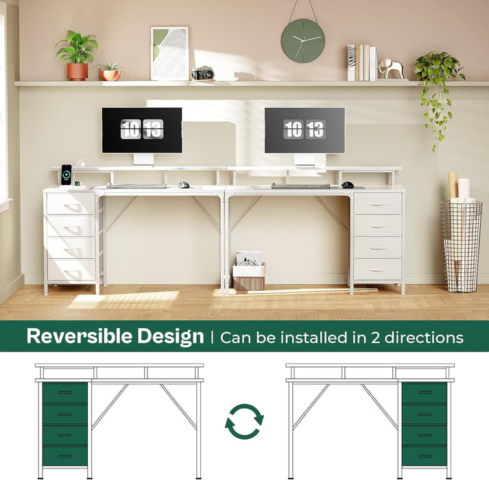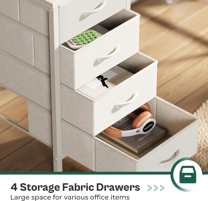 Designed for comfort and efficiency, this white desk combines a sturdy powder-coated metal frame with durable particle board. It features a built-in monitor stand to position your screen at eye level, four fabric drawers that can be mounted on either side, and a clean, uncluttered surface that adapts to work, study, or gaming.