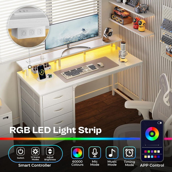 47 Inch LED Gaming Desk With Power Outlets White Drawers