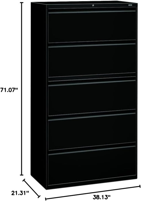 Crafted in the USA from sturdy steel, this black lateral file cabinet measures 36" wide by 19-1/4" deep by 67" high, delivering ample storage for letter- or legal-size filing in a sleek, space-conscious footprint. A counterweight is included where applicable to meet ANSI/BIFMA requirements, ensuring stability and safety with every use.