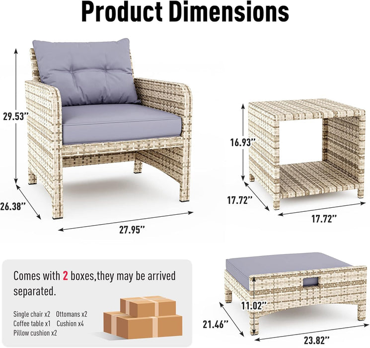 - Versatile design including 2 single chairs, 2 large ottomans, and 1 coffee table, perfect for lawn and garden settings or poolside gatherings.