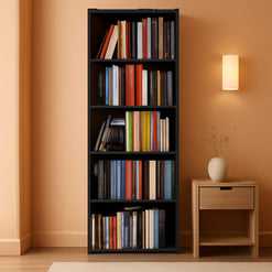 Available in Black (and White option) to suit your color preference, this 5-shelf bookcase brings order, warmth, and a touch of contemporary style to any space, helping you create a calm, inviting environment where everything has its place.