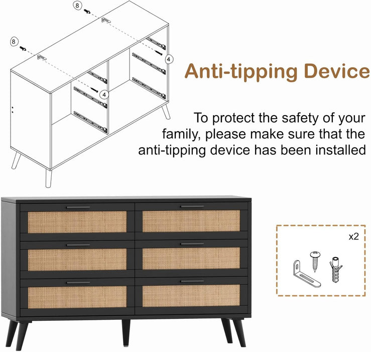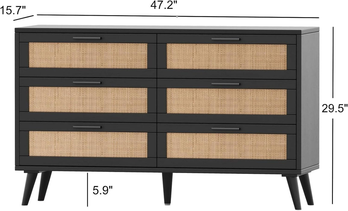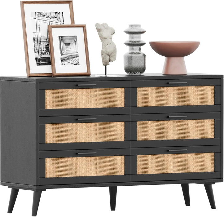 Transform clutter into calm with a 6-drawer dresser that blends mid-century charm and modern practicality. The woven rattan accents, angled legs, and golden handles bring warmth and style to bedrooms, living rooms, and entryways while keeping clothes, books, and bedtime essentials neatly organized.