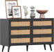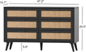 Product details: dimensions 47.2"L x 15.7"W x 29.5"H; color Black and Natural; material EPA-grade particleboard with rattan accents; package includes 1 dresser, instructions, and tools bag.