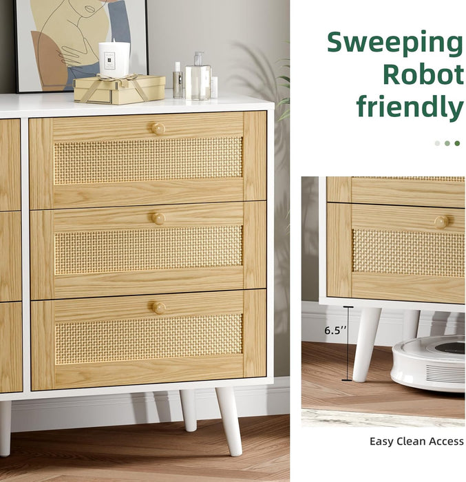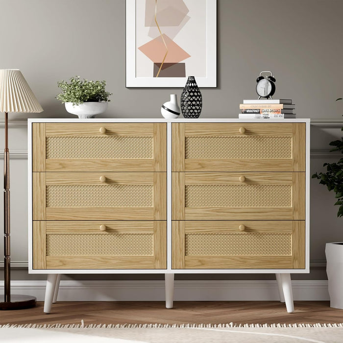 6 Drawer Rattan Modern Dresser in pristine white blends natural texture with contemporary lines to boost storage and style in bedrooms, living rooms, and hallways.