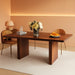 This modern farmhouse rectangular dining table blends clean lines with refined detail. The walnut finish pairs with a delicate lower line for a timeless look that fits both cozy and contemporary decor. A metal base wrapped by wood strips provides sturdy support while maintaining an open, elegant silhouette.