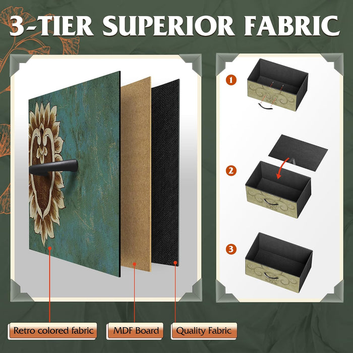 • Floral-painted fabric bins add decorative charm while keeping contents neatly concealed.