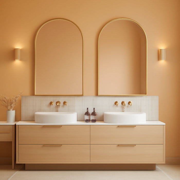 Brighten every reflection with a touch of gold. The 24" x 36" gold arched wall mirror brings timeless elegance to bathrooms, vanities, bedrooms, and living spaces, creating a sense of space and sophistication.