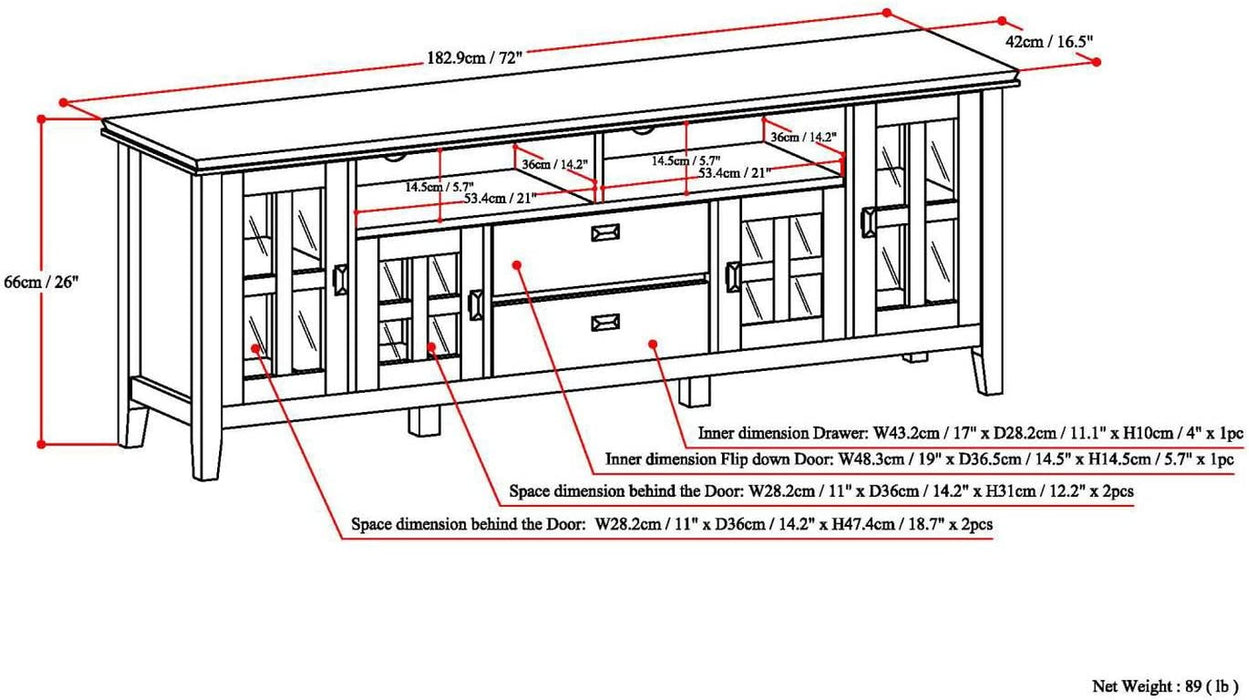 - Two drawers (one flip-down, one pull-out) for remotes, cables, and accessories.