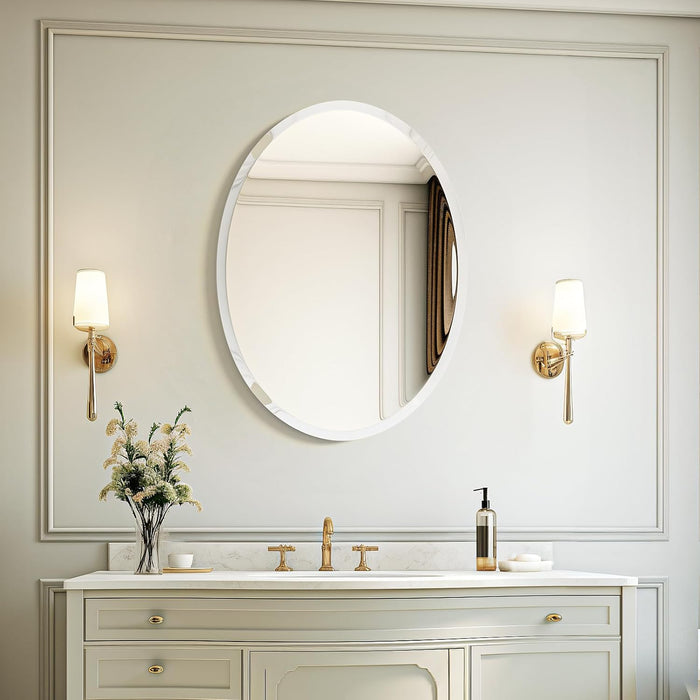 Brighten any space with a crisp, clear reflection. This 20x28 inch oval frameless bathroom mirror instantly enlarges small rooms and brings contemporary elegance to bathrooms, bedrooms, entryways, and vanity areas.