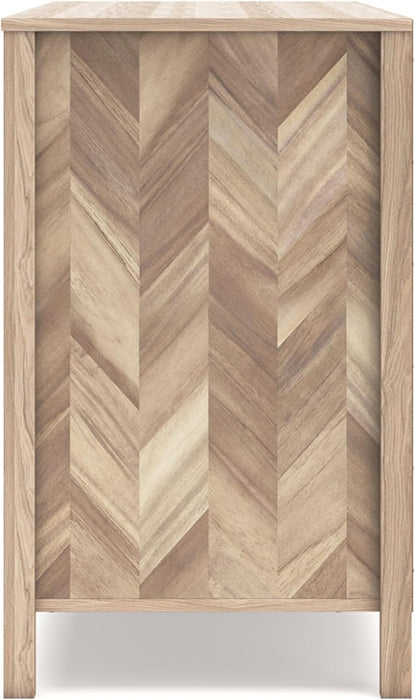 Design & materials This two-tone light brown dresser features a chevron pattern that mimics oak grain while staying affordable. Built with engineered wood (MDF/particleboard/plywood) and decorative laminate for durability that lasts.