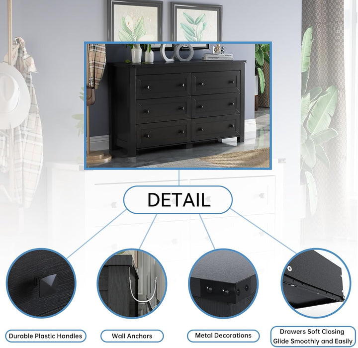 Black Dresser With 6 Drawers For Bedroom Modern Storage