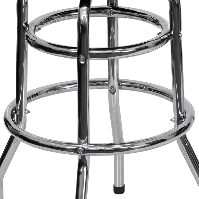 Elevate your space with the Bruno 2 Pack—two premium bar height stools that blend style, durability, and conversation-ready comfort. These round swivel stools feature a double ring chrome frame and easy-care black vinyl upholstery, making them a versatile choice for home bars, kitchen islands, or hospitality spaces.