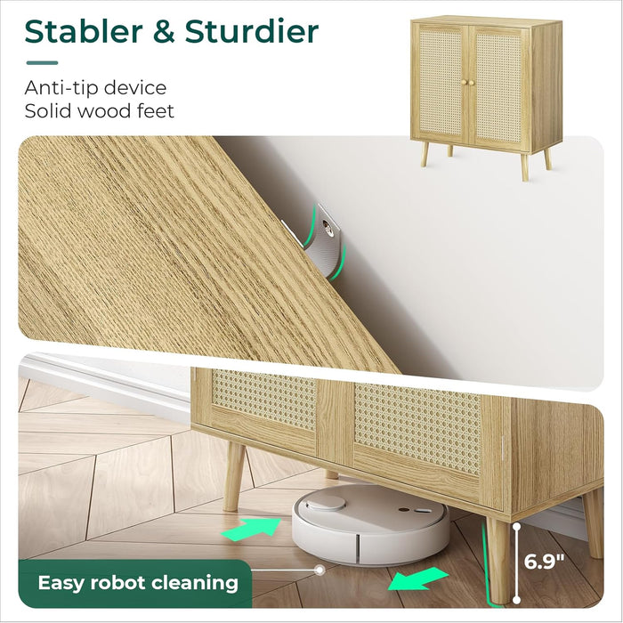 Design meets function with textural charm and sturdy construction. The rattan doors add warmth and visual interest, while solid wood feet provide lasting stability for everyday use.