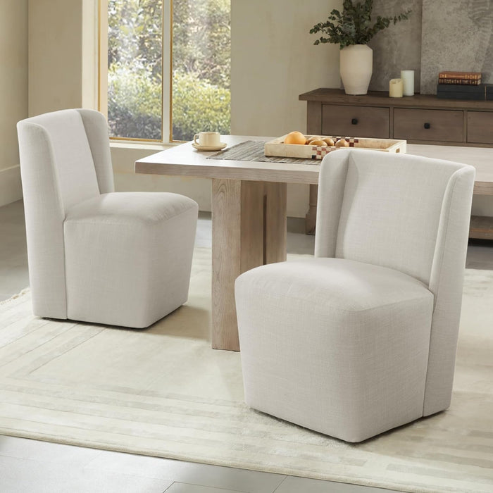 These chairs blend a classic wingback silhouette with soft fabric upholstery, a high-density foam seat, and a sturdy solid wood frame to deliver lasting support and comfort for long meals and conversations. The armless design adds freedom of movement while maintaining a sleek, modern look.