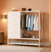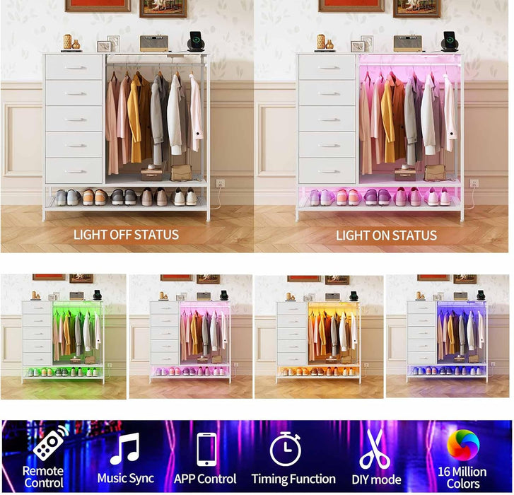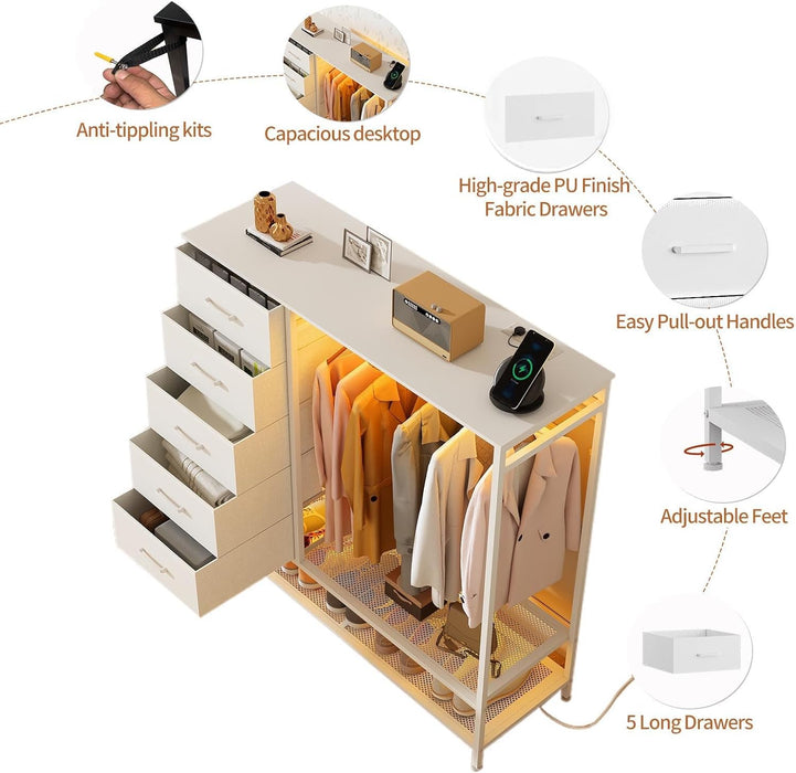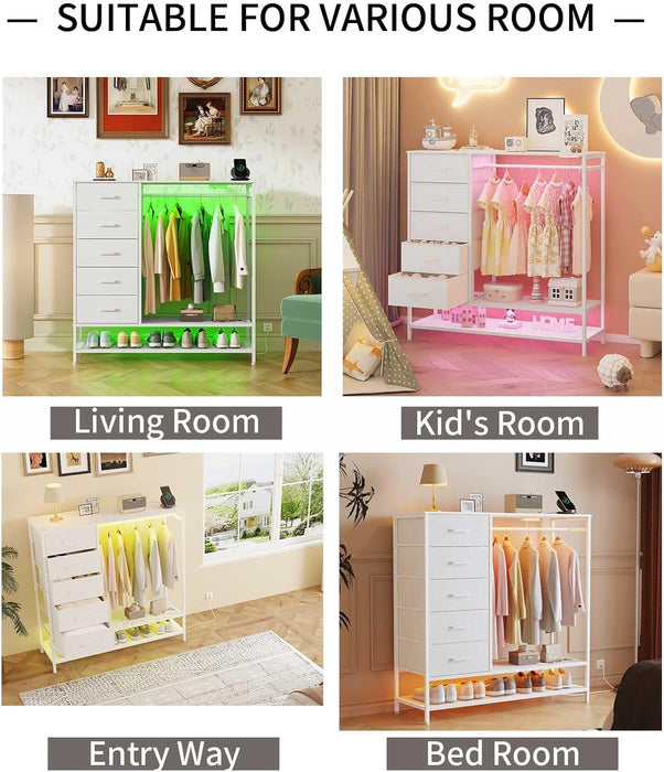 Transform clutter into calm with a single, stylish dresser that does more than store clothes. This white, 3-in-1 unit blends a tall dresser, a hanging garment rack, and a bottom shoe shelf with built-in LED lights and a charging station—designed to simplify daily routines and keep spaces tidy.