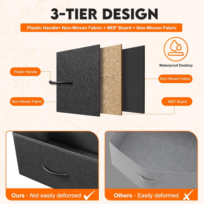 Maximize every inch of your space with a 10-drawer fabric dresser that combines storage, style, and stability. This large-capacity chest of drawers features a rugged wood top and sleek black fabric bins, making it a versatile storage solution for bedrooms, closets, nurseries, living rooms, or entryways.