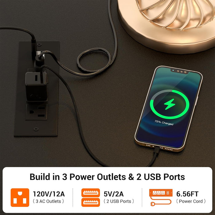 • Built-in charging station with 3 outlets and 2 USB ports to power up to five devices right at your fingertips.