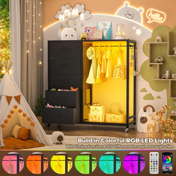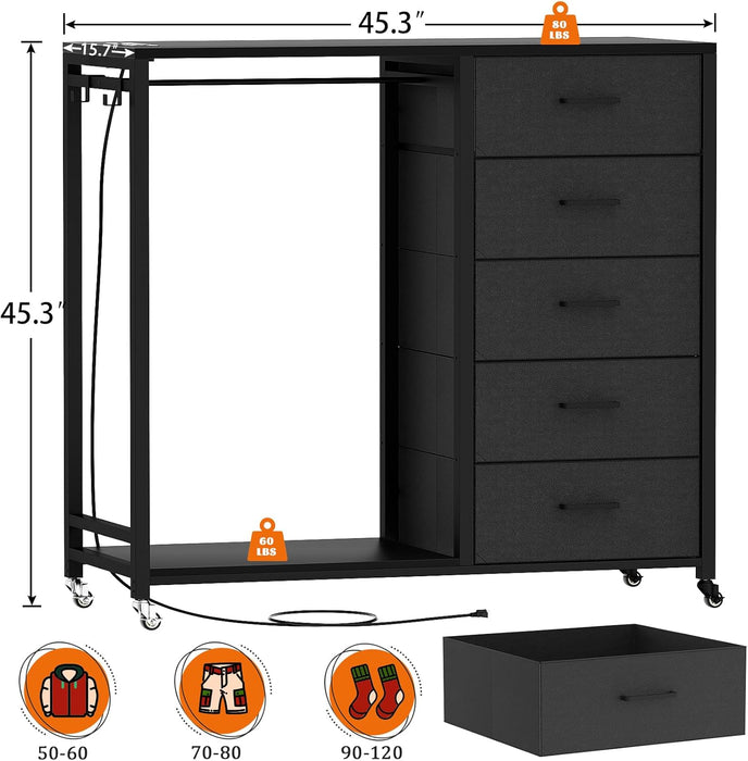 Transform your bedroom with a 2-in-1 dresser and clothes rack—where storage meets effortless convenience. This sleek black dresser combines hanging space, five roomy drawers, a built-in charging station, and vibrant LED lighting to simplify mornings and keep your space calm and organized.