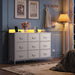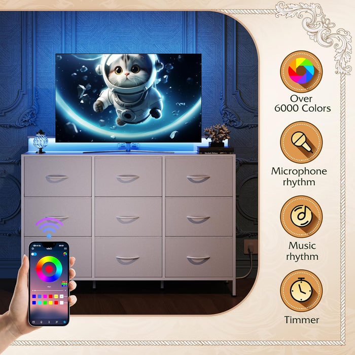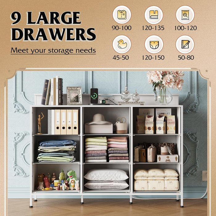 The sturdy design combines a thick wood top with a metal frame to provide reliable support for your TV and daily essentials. The top holds up to 66 lbs, and nine fabric drawers offer generous, easy-access storage for clothes, accessories, or media.