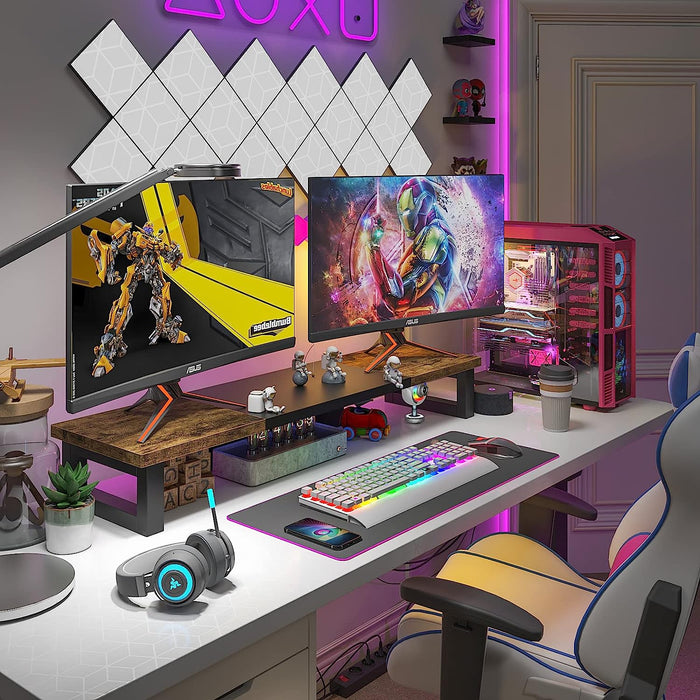 Transform your workspace with a Dual Monitor Stand Riser that lifts two screens to eye level, freeing desk space and reducing neck strain. This ergonomic monitor stand combines rustic wood visuals with rugged steel, delivering a product that looks as good as it performs.