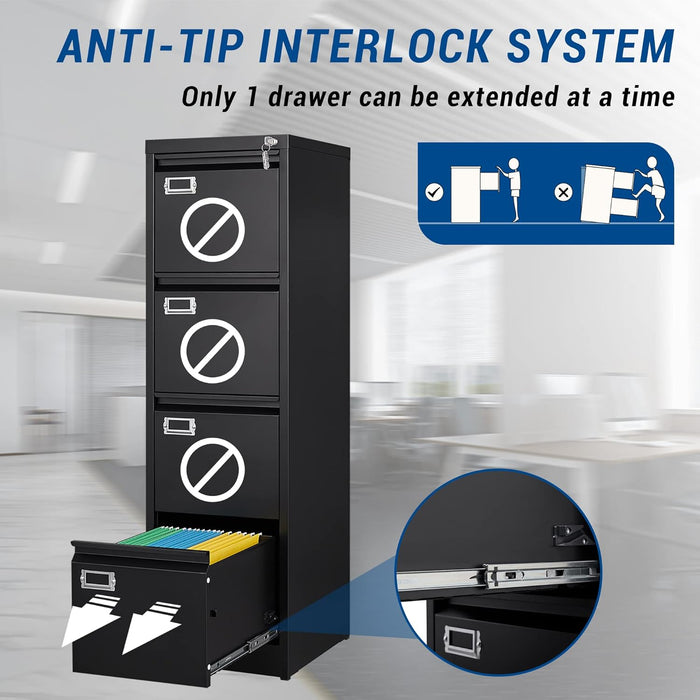 Secure, space-saving filing cabinet for a neater home office — a lockable, 4-drawer vertical solution that keeps letters, legal documents, and hanging files organized in a sleek black metal design.