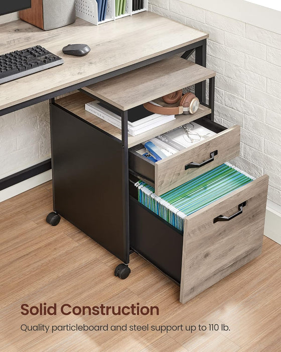 Designed for small spaces, its compact footprint slides neatly under a desk to maximize your workspace without sacrificing storage. The greige surface paired with a black steel frame delivers a stylish industrial vibe that fits modern home offices and compact studios.