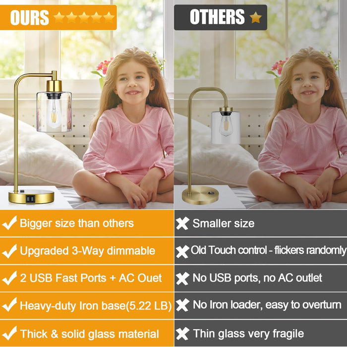 Transform your space with a pair of industrial touch control table lamps that blend rugged, modern style with everyday convenience. This set of 2 industrial touch control table lamps in a warm gold finish features a thick glass shade, a stable weighted base, and built-in charging to power your devices while you relax.