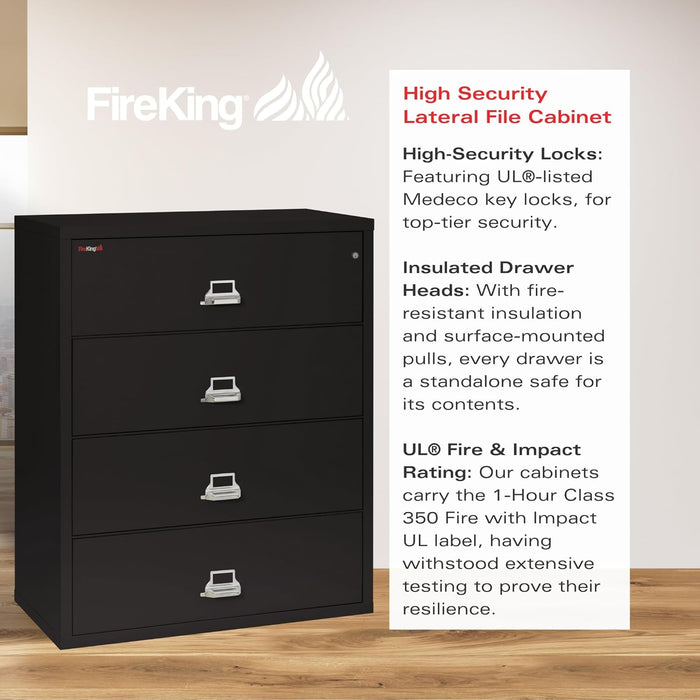 Protect your most valuable documents with confidence—the Lateral 4 Drawer Fire Safe File Cabinet delivers 1‑hour fire protection, UL rating, and water resistance in a rugged, USA‑made steel cabinet.
