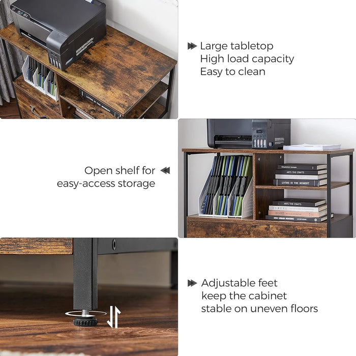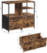 Color: Rustic Brown and Black • Material: Particleboard, Steel • Product Size: 32.3" L x 15.7" W x 29.5" H (82 x 40 x 75 cm) • Drawer Interior: 28.6" L x 13.3" W x 10.7" H • Open Shelf Heights: Large 13.4" (34 cm); Small 6.5" (16.4 cm) • Weight: 47.7 lb (21.7 kg) • Max Static Load: 110 lb (50 kg).