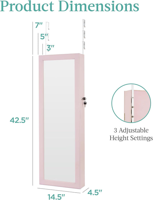Turn any doorway into a personal dressing suite with the LED Mirror Jewelry Cabinet in Dusty Pink. This tall, lockable jewelry armoire combines a full-length mirror, smart LED lighting, and expansive storage to simplify your routine while protecting your precious accessories.