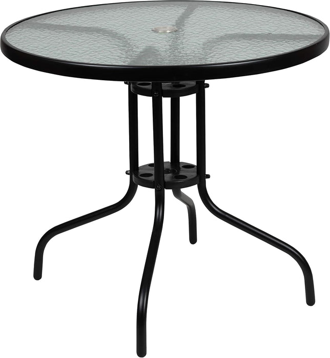 - Tempered glass dining table with a 5mm thick, water-wave glass top sits on a powder-coated steel frame for lasting durability; protective floor glides keep indoor surfaces scratch-free.