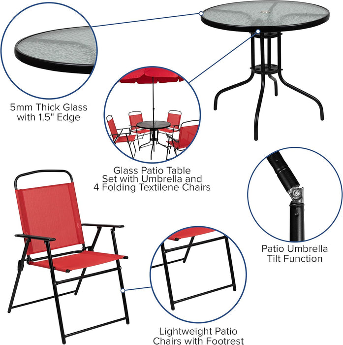 Elevate outdoor dining and everyday relaxation with the Nantucket 6 Piece Red Patio Garden Set. This complete outdoor dining set brings together a tempered-glass table, four folding chairs, and a tilt umbrella—perfect for entertaining on patios, decks, or balconies.