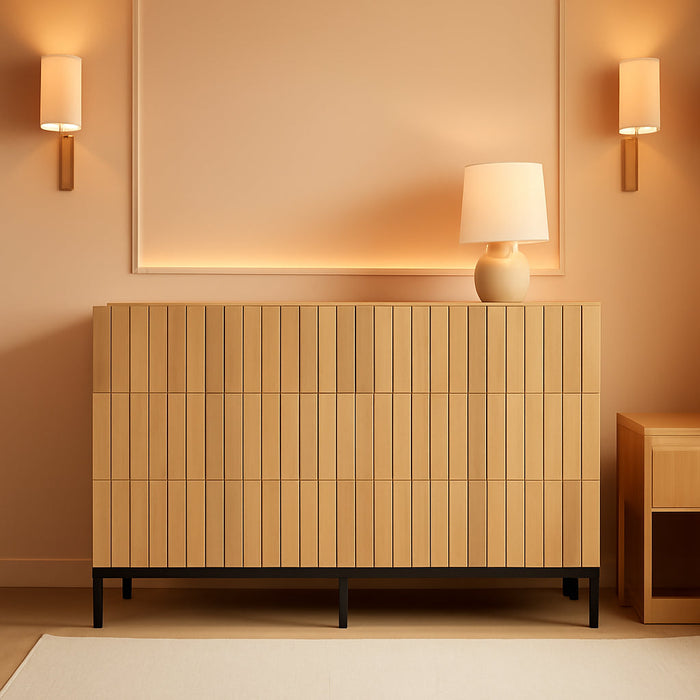 Natural Wood Dresser Mid Century Modern Fluted Six Drawer