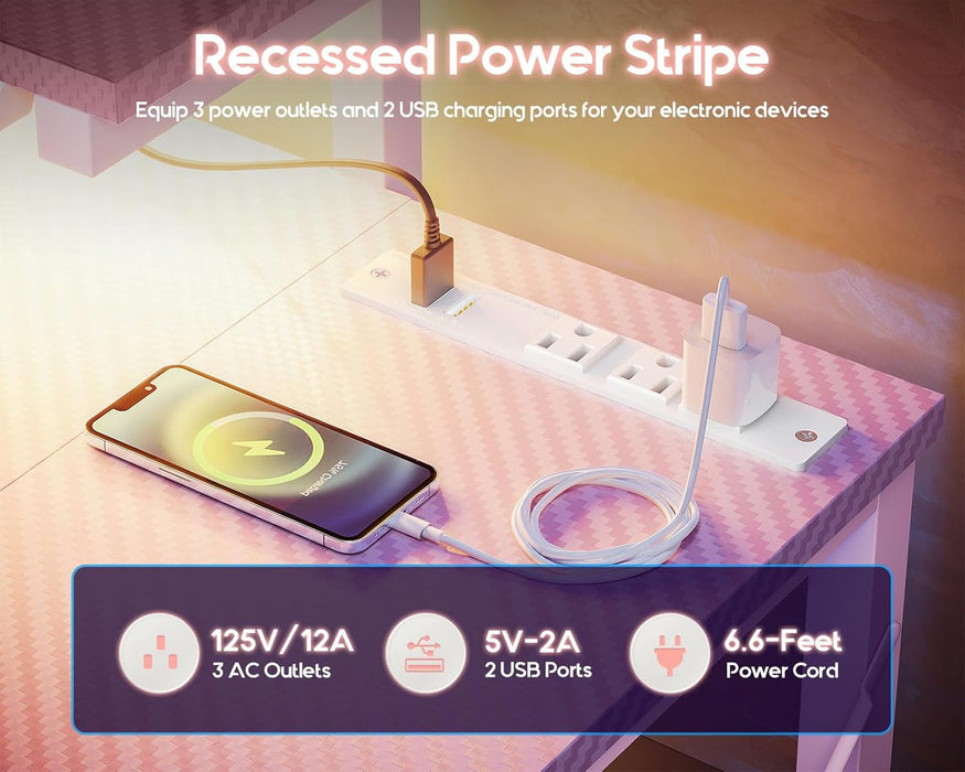 Elevate your gaming setup with a 40-inch pink gaming desk that powers your play while keeping every accessory within easy reach. This desk brings bold color, built-in power, and smart organization into one sleek, carbon fiber–textured frame designed for long sessions and focused play.