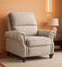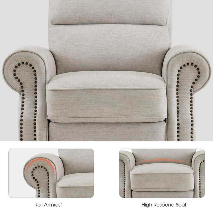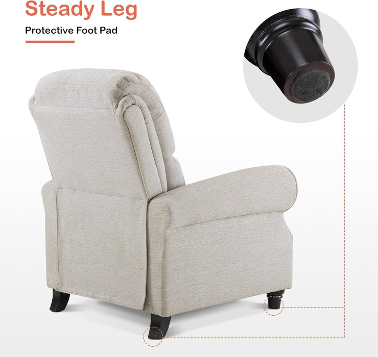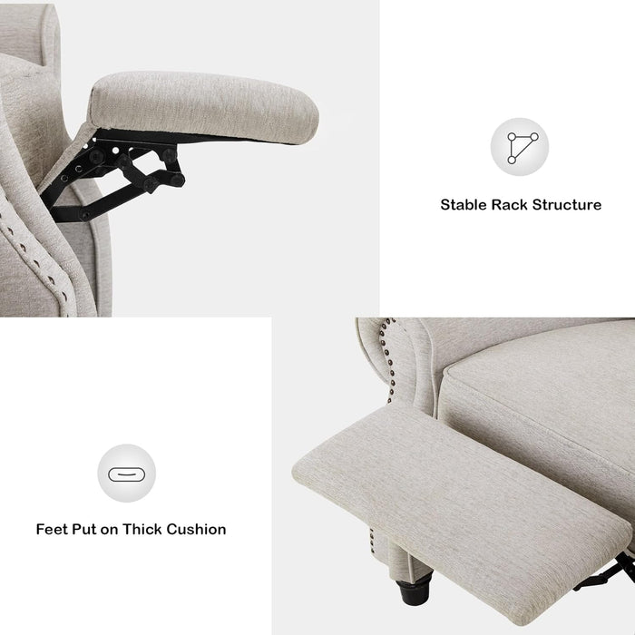 Relax instantly with a single push. The Beige Chenille Pushback Recliner Chair delivers effortless comfort for your living room or office, blending plush support with timeless style.