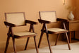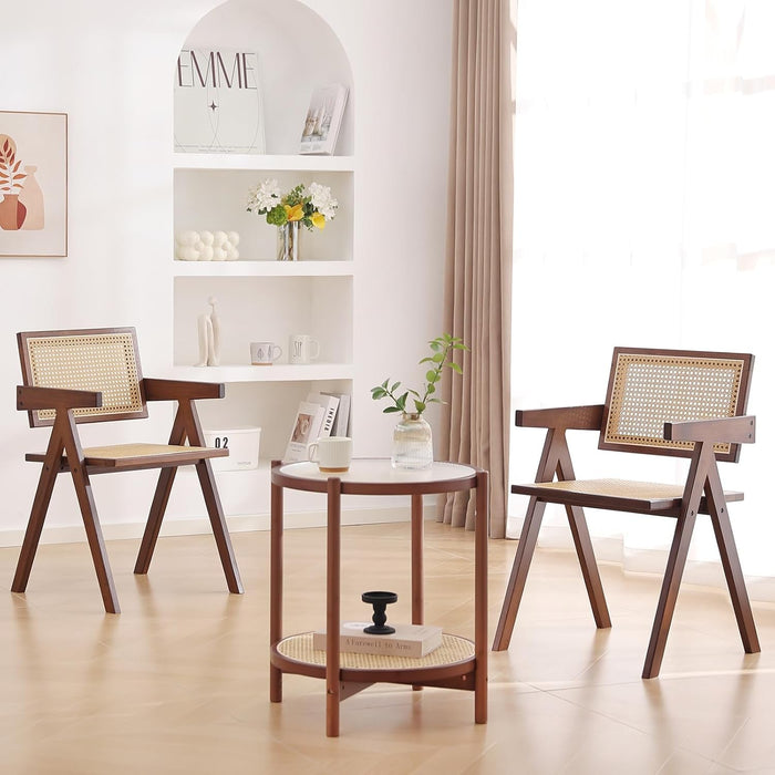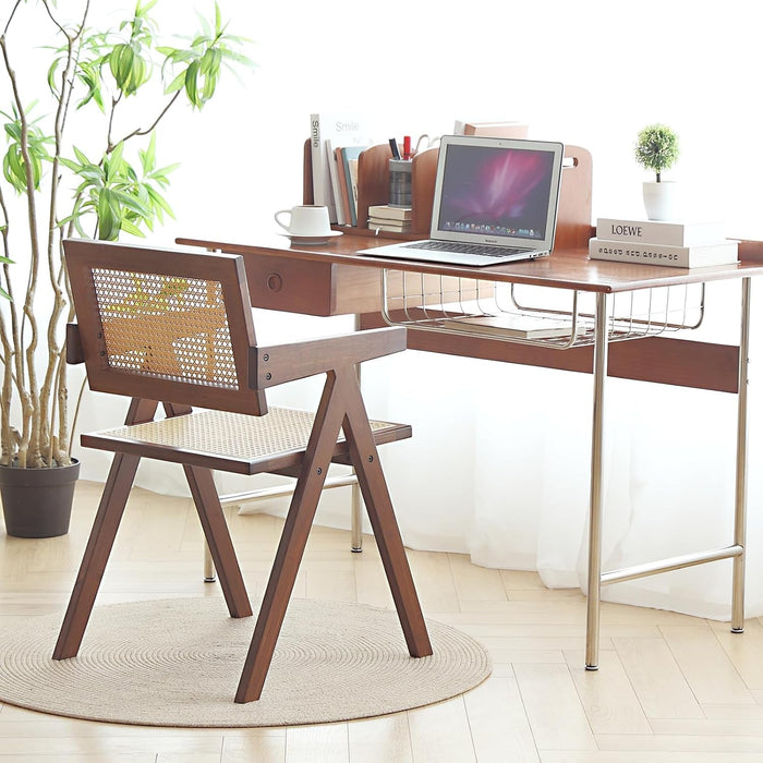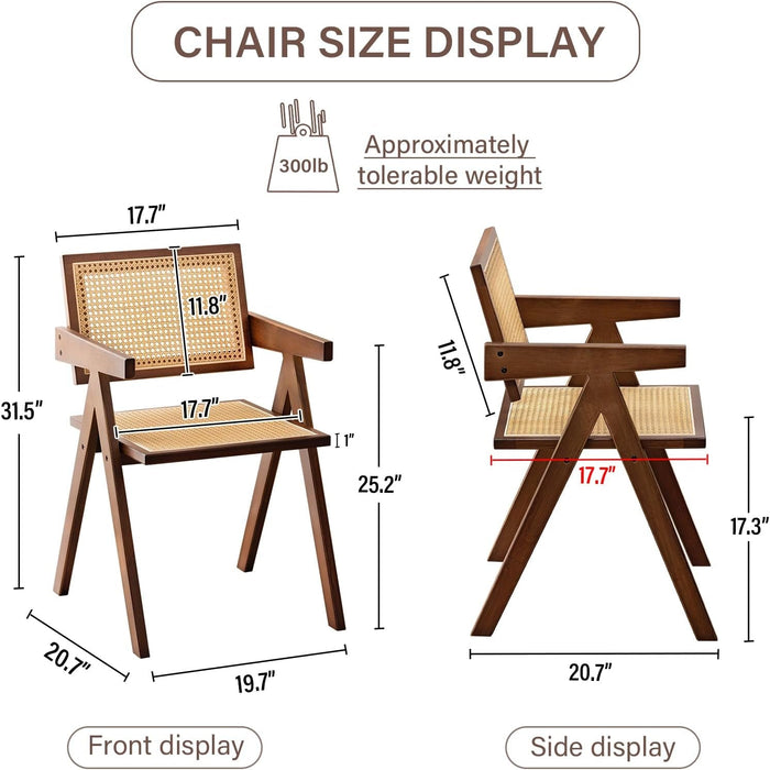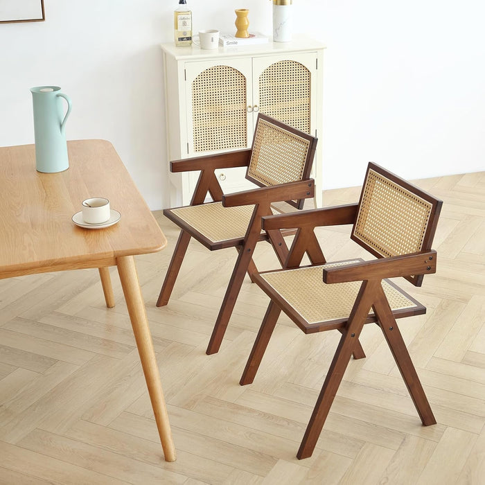 Elevate your dining space with a pair of rattan dining chairs that fuse mid-century charm with everyday comfort. This set of 2 combines a warm walnut finish, a sturdy solid wood frame, and breathable rattan backrests for an inviting seating experience in dining rooms or living areas.