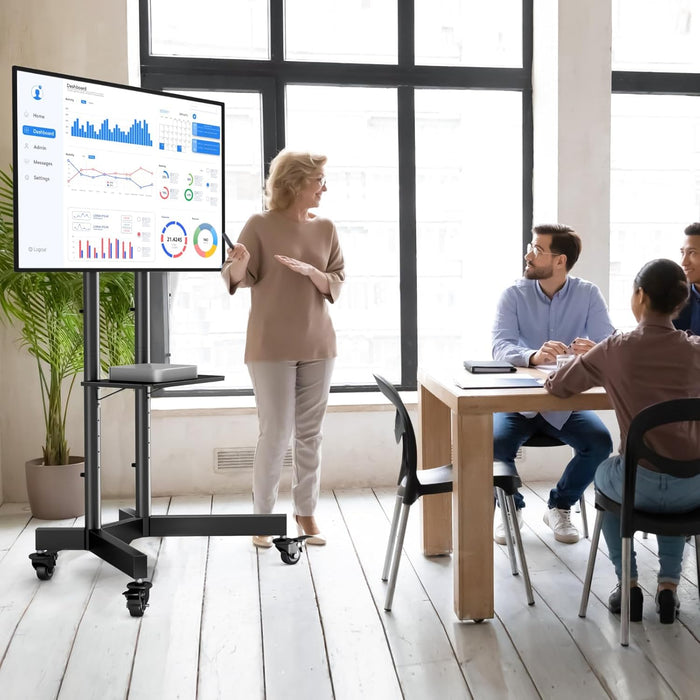 Designed for homes, offices, and exhibitions, this rolling TV stand offers a clean, professional appearance and effortless rearrangement. It complements any decor while enhancing your viewing experience, helping you create engaging presentations or cozy movie nights with confidence.