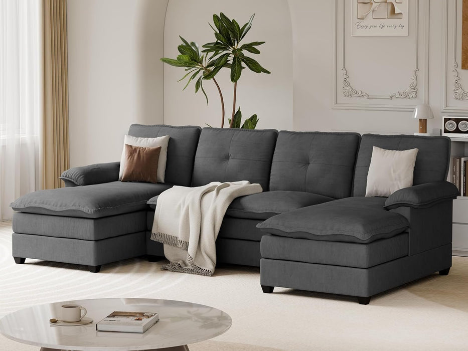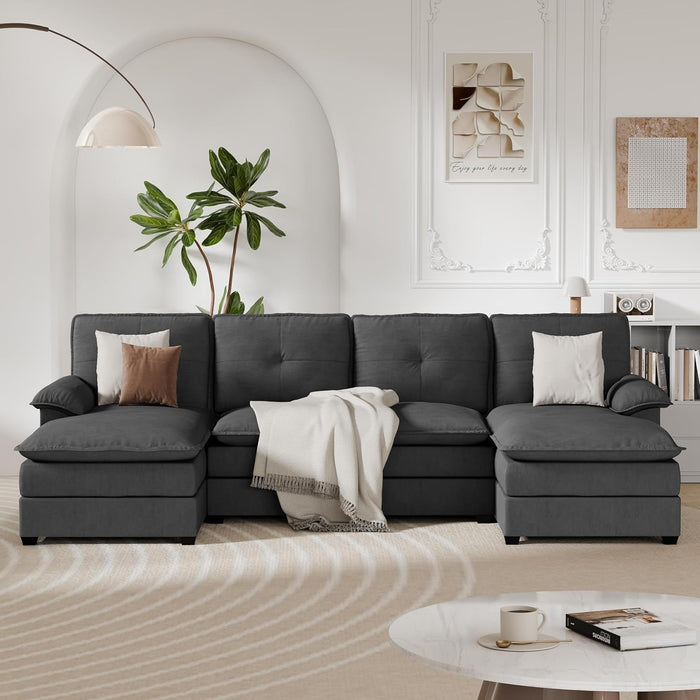 Transform your living space into a sanctuary of relaxation with the Comfy U-Shaped Sectional Couch with Chaise and Ottoman. This oversized sofa couch redefines comfort, offering a cloud-like experience with its double-layer cushions filled with sponge, foam, and spring packs. With a generous 110” long seating area, it’s perfect for lounging and enjoying leisure time in your home.