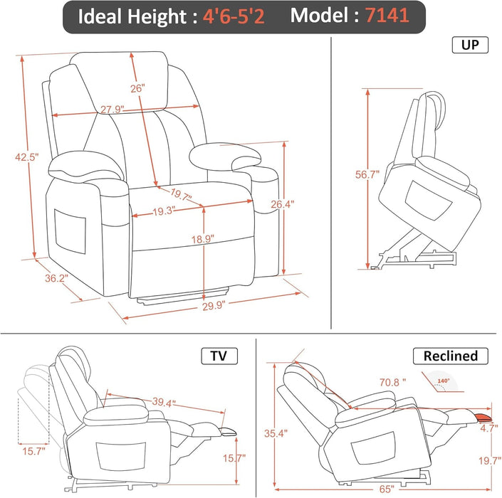 • Petite-friendly power lift recliner: Smaller seat dimensions with a recommended height range of 4'6"–5'2" for a secure, comfortable fit.